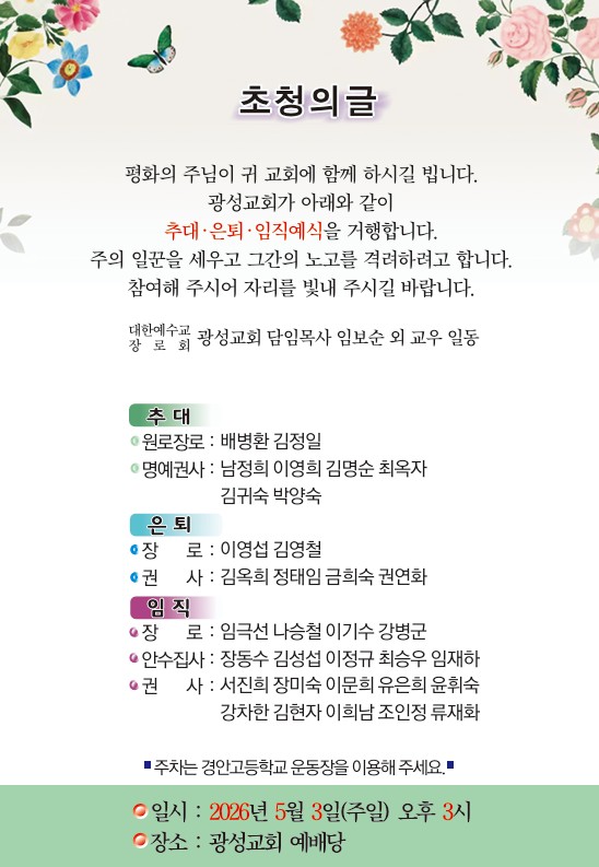 Á¦¸ñ   [°ø¹®] ±¤¼º±³È¸ Ãß´ë,ÀºÅð,ÀÓÁ÷¿¹½Ä(5/3)